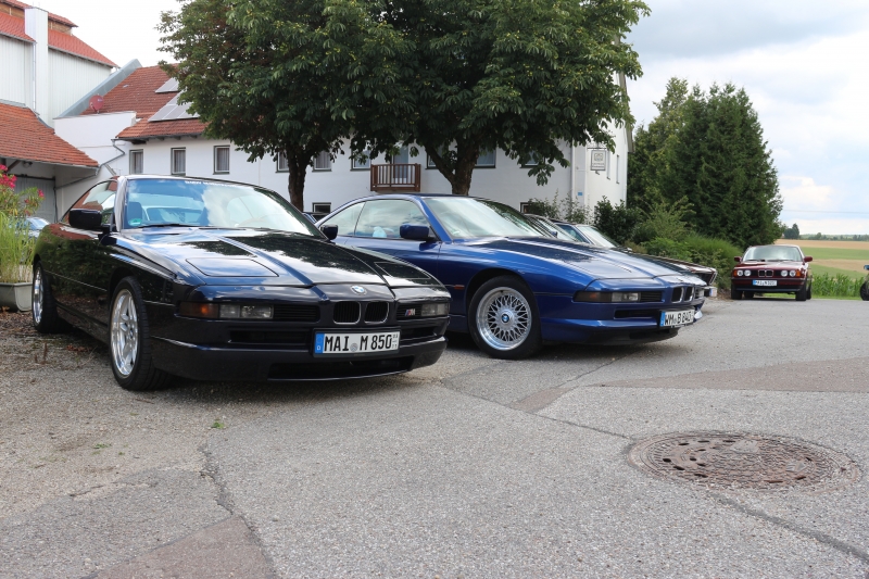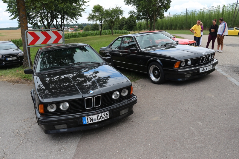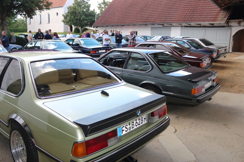 Wie immer begann das Treffen eigentlich schon am Freitag, wo einige 6er und 8er Fahrer bei mir zu Hause zum Grillen auftauchten. Samstag war dann ab 10 Uhr Treffpunkt in Herrenau, beim Gasthaus Kreitmeier wo es gegen Mittag Weißwurst, Brezn und Kaltgetränke gab. Bis ca. 13 Uhr waren es dann stattliche 34!!! 6er, 2 E30 Cabrio, 2 8er, 1 E34 und ein E36 Compact, die bei teils wechselndem Wetter (aber kein Regen) den Weg in die Hallertau fanden. Dann gings los zu einer 70km langen Ausfahrt. Für dieses Treffen hatte ich einen Hobbyfotografen organisiert, der unsere 6er sehr gut in Scene setzte. Ziel war wieder mal das Schloß Ratzenhofen mit seinem großen Biergarten, wo bei Kaffee, Kuchen, Brotzeit und die eine oder andere Maß die Kehle runterlief. Bei etlichen Benzingesprächen ließen wir den Tag langsam zu Ende gehen.
